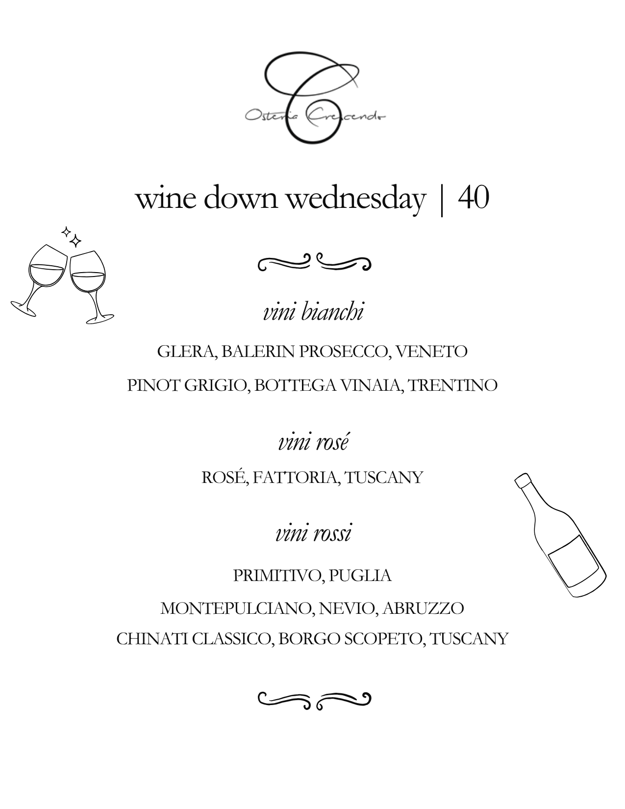 Unwind midweek with $40 select bottles of wine, available every Wednesday this fall and winter. Whether you’re catching up with friends or winding down after work, enjoy exceptional wines curated by our beverage team!